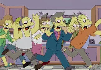 They then go to an adult Halloween party thrown by Homer (dressed as Zorro) and Marge (dressed as Catwoman), but are soon confronted by their wives (who are just feminine versions of the classic monsters), who are angry that their husbands lied about going to kill children. Homer tries to intervene as the wives begin to assault their husbands, only to be decapitated. Homer's head falls into a bowl of punch when an "X" appears on each of his eyes. "Treehouse of Horror" appears over his eyes that read "XX", summing up to "Treehouse of Horror XX", the title of the episode.