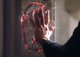 The angel banishing sigil is a form of blood magic that must be drawn in fresh human blood. The sigil is activated when a hand is slapped onto the center of the sigil. It temporarily banishes angels (except the one who drew it) from that location. The amount of time the angel stays gone is only a matter of hours.