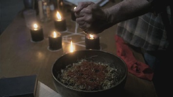 Crowley could be summoned through a ritual specific to him.This spell required the use of a sigil, lit candles aligned with the sigil, a bowl of several mixed ingredients and the blood of the summoner. The bowl must then be set aflame by throwing a matchstick into it.